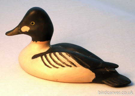 This Goldeneye is sculpted from lime tinted with chinese ink stick and finished with wax. It is 11.5 cm (approx. 4.5") in length and is signed by the artist.