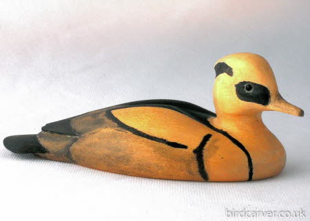 This Smew drake is sculpted from lime tinted with chinese ink stick and finished with wax. It is 11 cm (approx. 4.5") in length and is signed by the artist.