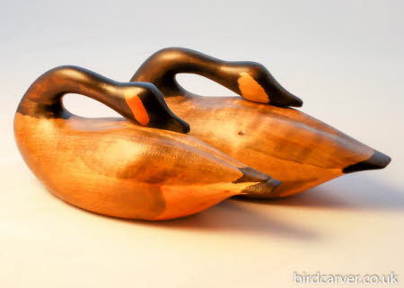 These sleeping Canada Geese are sculpted from lime tinted with chinese ink stick and finished with wax. They are 13 cm (5") in length and are signed by the artist.