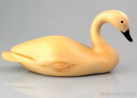 Bewick's Swan about to feed.The Bewick's Swan is sculpted from lime tinted with chinese ink stick and finished with wax. It is 12.5 cm (5") in length and is signed by the artist.