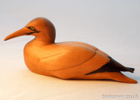 This Gannet is captured sitting at its nest site and is sculpted from lime, tinted with chinese ink stick and finished with wax. It is 13 cm (approx. 5") in length and is signed by the artist.